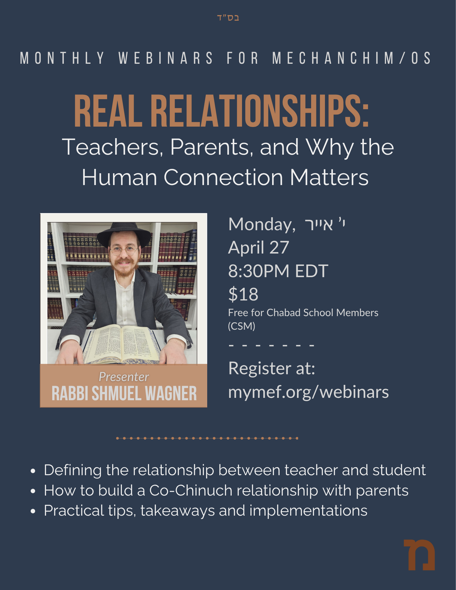 Real Relationships: Teachers, Parents, and Why the Human Connection Matters + Add to Google Calendar + iCal / Outlook export 00 days 00 hours 00 minutes 00 seconds Book Event $18 $18.00 Available Tickets: Unlimited The "$18" ticket is sold out. You can try another ticket or another date. Next Date Apr 27 2026 Time 8:30 pm - 9:30 pm Local Time Timezone: America/New_York Date: Apr 27 2026 Time: 8:30 pm - 9:30 pm Category Mechanchim Mechanchos REGISTER Share this event